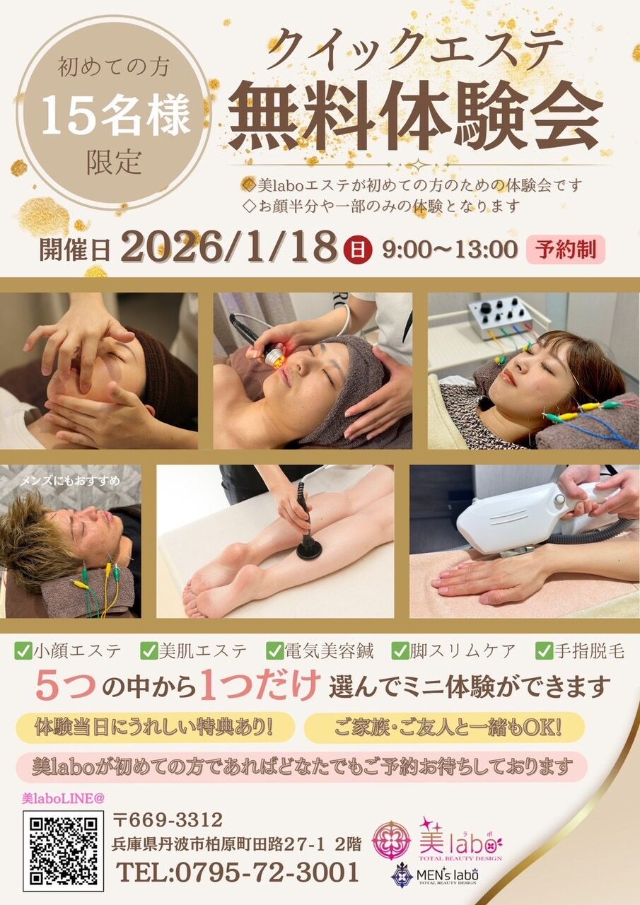 1/18(日)無料開催!エステが初めての方限定❄️丹波市の美labo 無料体験会